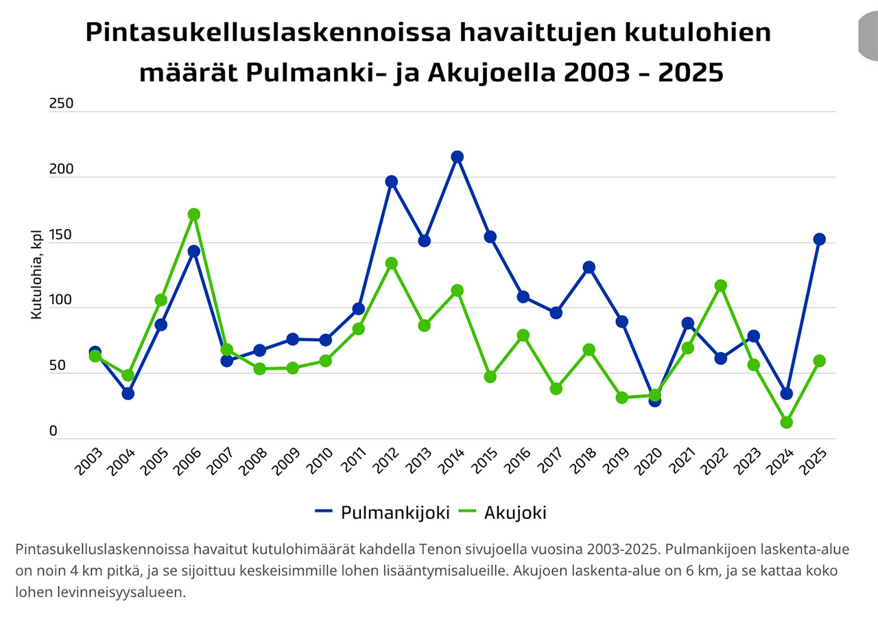 ”Tenon lohimäärän kasvusta saatiin tarkkaa ja ajantasaista tietoa syyskuun alussa toteutetuissa sivujokien sukelluslaskennoissa. Kahdessa pitkään seuratussa sivujoessa lohimäärät nelin-viisinkertaistuivat vuoteen 2024 verrattuna”, kertoo Luken tutkija Panu Orell.