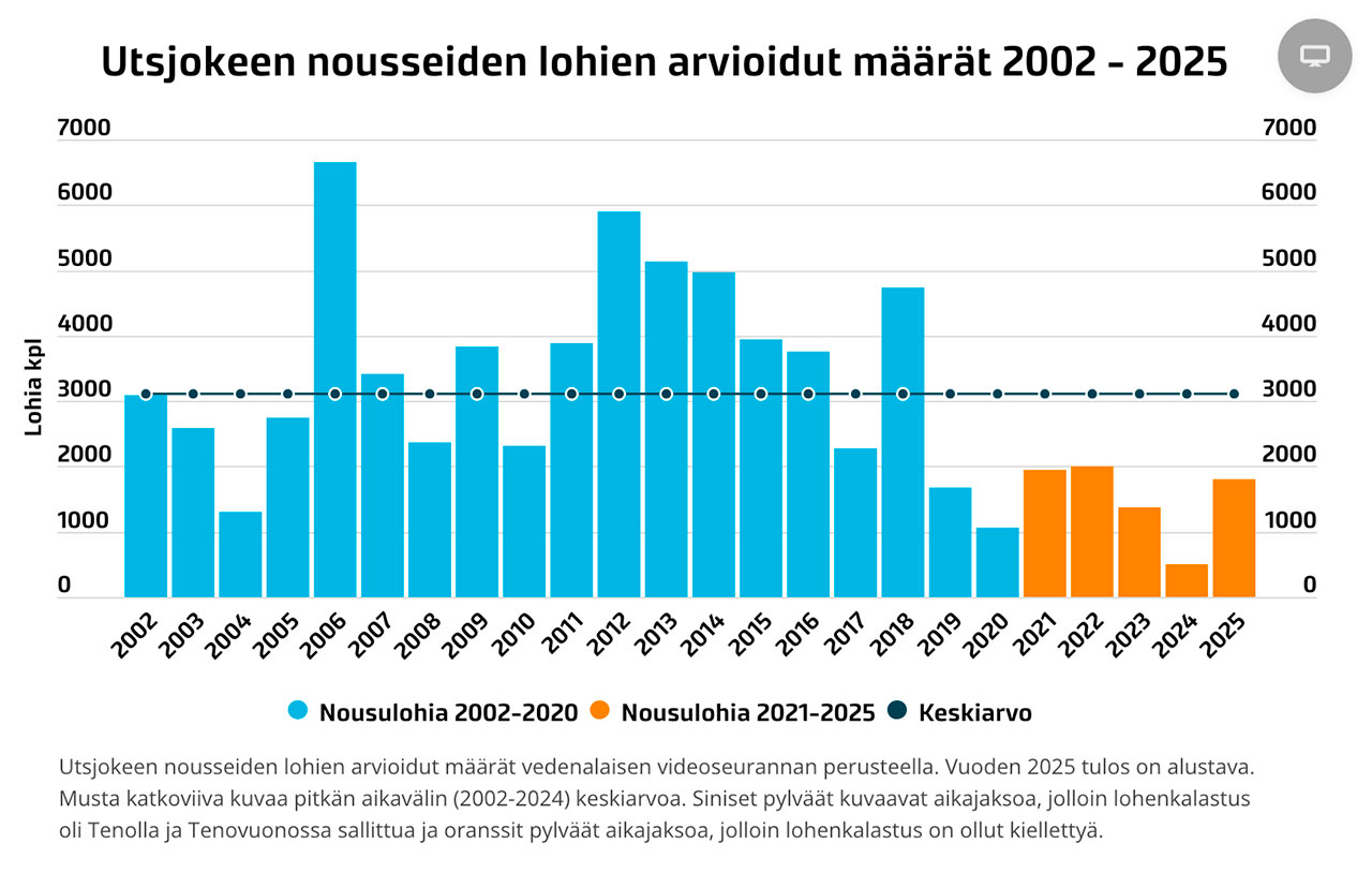 Nousulohien määrä kasvoi Tenolla selvästi verrattuna ennätysmäisen heikkoon vuoteen 2024. Lohimäärän kasvu johtui lähinnä pienten yhden merivuoden lohien määrän kasvusta. Kokonaisuudessaan mereltä palaa Tenoon edelleen heikosti lohta.