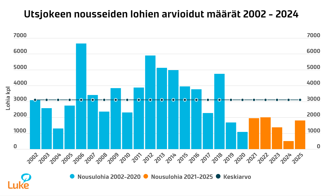Kuva 2. Utsjokeen nousseiden lohien arvioidut määrät vuosina 2020-2025 vedenalaisen videoseurannan perusteella. Vuoden 2025 tulos on alustava. Musta katkoviiva kuvaa pitkän aikavälin (2002-2024) keskiarvoa. Siniset pylväät kuvaavat aikajaksoa, jolloin lohenkalastus oli Tenolla ja Tenovuonossa sallittua ja oranssit pylväät aikajaksoa, jolloin lohenkalastus on ollut kiellettyä. Molempien kuvien tarkat luvut löytyvät Luken verkkosivun kuvista. Tenoon palaava lohimäärä edelleen pieni.Tenojokeen nousseiden kyttyrälohien määrä noin puolittui verrattuna edelliseen nousuvuoteen 2023. Vastaava väheneminen havaittiin laajalla alueella Norjan Itä-Finnmarkissa mukaan lukien Näätämöjoella.